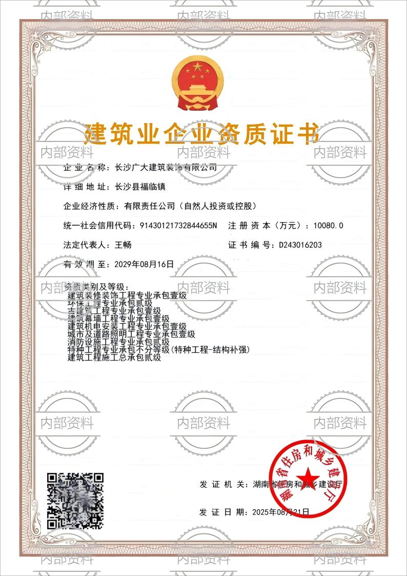 三、項(xiàng)目管理和經(jīng)典業(yè)績(jī):公司在質(zhì)量把關(guān)上,嚴(yán)格按照法規(guī)和技術(shù)規(guī)范進(jìn)行施工及管理,執(zhí)行GB/T19001—ISO9001質(zhì)量管理和質(zhì)量保證體系,做到三堅(jiān)持:堅(jiān)持管理制度化、堅(jiān)持現(xiàn)場(chǎng)標(biāo)準(zhǔn)化、堅(jiān)持服務(wù)規(guī)范化,在安全措施上以專業(yè)精神,精細(xì)管理,嚴(yán)格執(zhí)行質(zhì)量安全標(biāo)準(zhǔn)化體系生產(chǎn),一如既往的杜絕一切安全和事故的發(fā)生,多項(xiàng)工程獲得國(guó)家、省部級(jí)大獎(jiǎng),其中成都天府機(jī)場(chǎng)、二一工程、浦發(fā)銀行長(zhǎng)沙分行、新鄭機(jī)場(chǎng)、北京協(xié)和醫(yī)院、省質(zhì)量技術(shù)監(jiān)督檢測(cè)中心、省移動(dòng)樞紐樓、解放軍總后大禮堂等19個(gè)項(xiàng)目榮獲全國(guó)行業(yè)最高獎(jiǎng)項(xiàng)魯班獎(jiǎng);皇冠假日酒店、湖南省兒童醫(yī)院兒童、頤惠園配建酒店、北京新機(jī)場(chǎng)工程、湘江集團(tuán)大廈、九所賓館三六號(hào)樓、超算長(zhǎng)沙中心等29個(gè)項(xiàng)目榮獲全國(guó)建筑裝飾獎(jiǎng),獎(jiǎng)項(xiàng)體現(xiàn)質(zhì)量和管理,眾多國(guó)家級(jí)大獎(jiǎng)的獲得在國(guó)內(nèi)產(chǎn)生了巨大影響,樹立了“廣大裝飾”品牌。